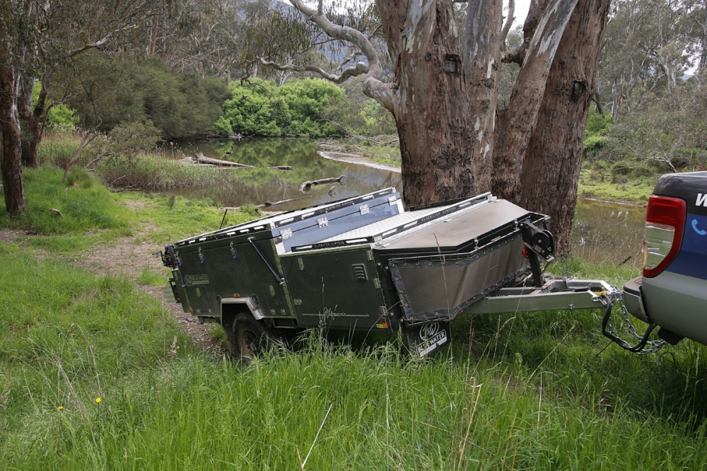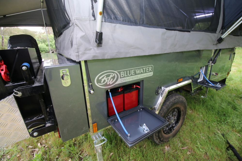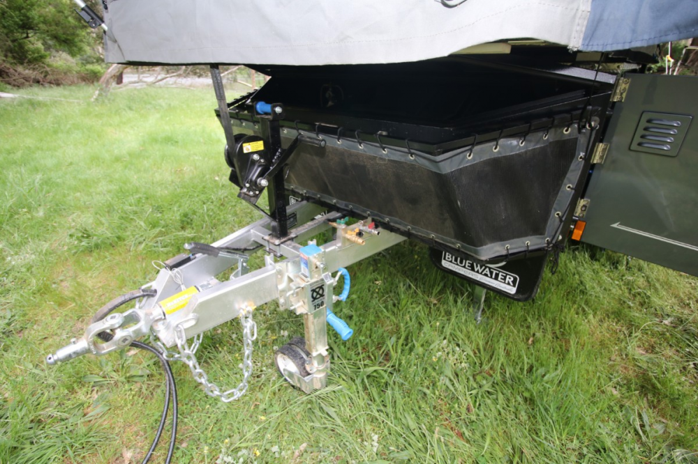 The underside is also well-designed, with twin-rated recovery points and a slide fitting for an optional push bike carrier. The recovery angle is good, so the trailer's bum won't drag in heavy undulations. The water tanks are fully shrouded for protection and fitted with sturdy bungs and fittings. One minor point worth noting is the water tank supply line – a solid elbow fitting would reduce the chance of the hose ripping from the tank fitting, especially in hot and remote destinations. However, Bluewater assured me that this will be fitted as standard in future models, which is great to hear.
