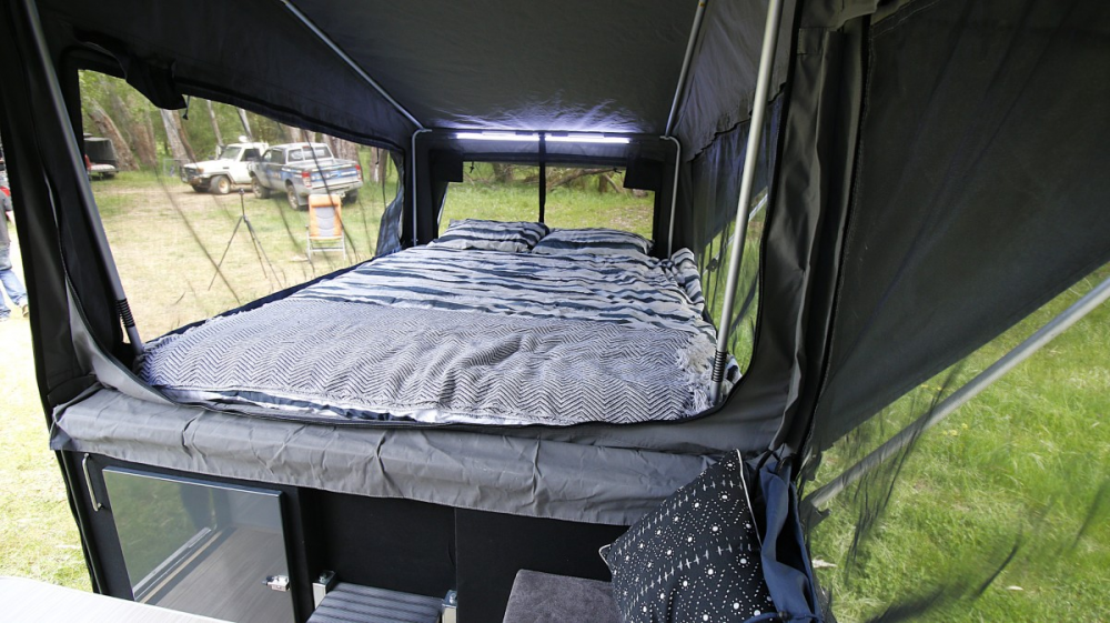 The sleeping compartment is designed for comfort, with a queen-size Australian-made inner spring mattress and a handy step to help you get in. The tent is surprisingly spacious, with a tall ceiling that creates a sense of volume and helps keep things cool in the heat.
