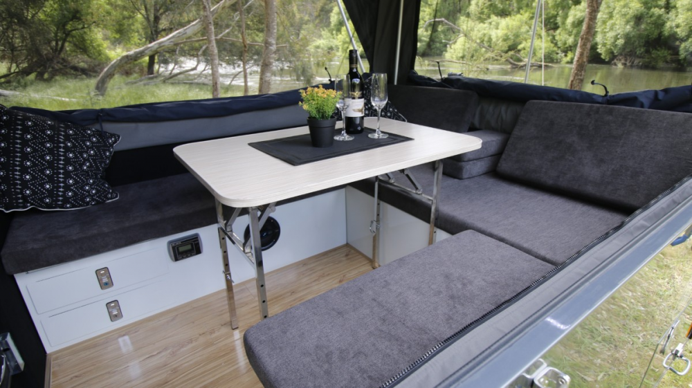 There are plenty of power outlets throughout the camper, and you can even opt for 240-volt power if needed (though it wasn't included in our demo model). The internal upholstery has been upgraded with luxurious yet durable textures, adding to the overall comfort of the space. One of the best features is the central table, which drops down to create the base for a double bed, utilising the thickly padded cushions. The lounge area has been redesigned to be taller, creating a more inviting atmosphere, and the kitchen side can be fully unzipped for true open-plan living – perfect for relaxing and socialising with family and friends.