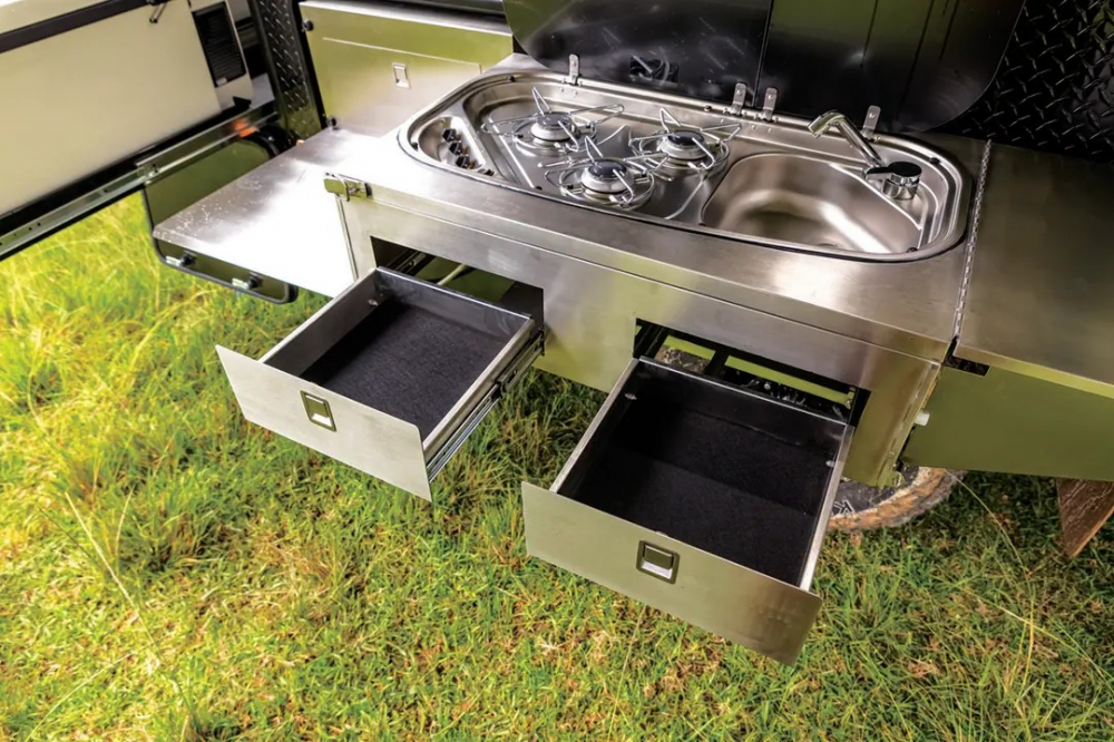The Stoney Creek Scout-14 is well-appointed for those looking to leave the city lights behind. Outside, there’s everything you need to cook up a great meal, with a swing-out kitchen including a 3-burner Dometic stove, sink, plumbed water and adequate food preparation spaces.