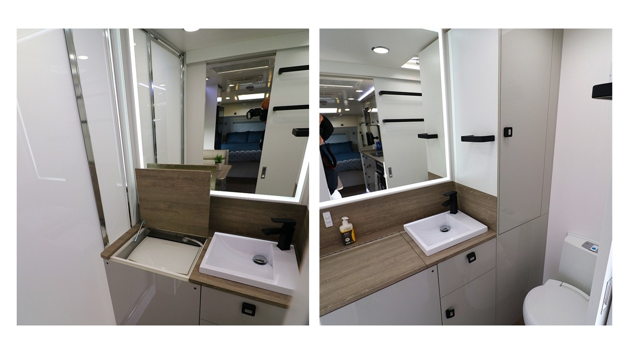 I was also quite impressed with the fitting of a touch sensitive backlit vanity mirror above a ceramic bowl with a mixer, plus even more handy bench space formed by the hinged top over the washing machine recess. There’s enough room on the toilet even for those of larger proportions, and the separate moulded shower is a ripper. It all had plenty of light, ventilation hatches and extraction fans.
