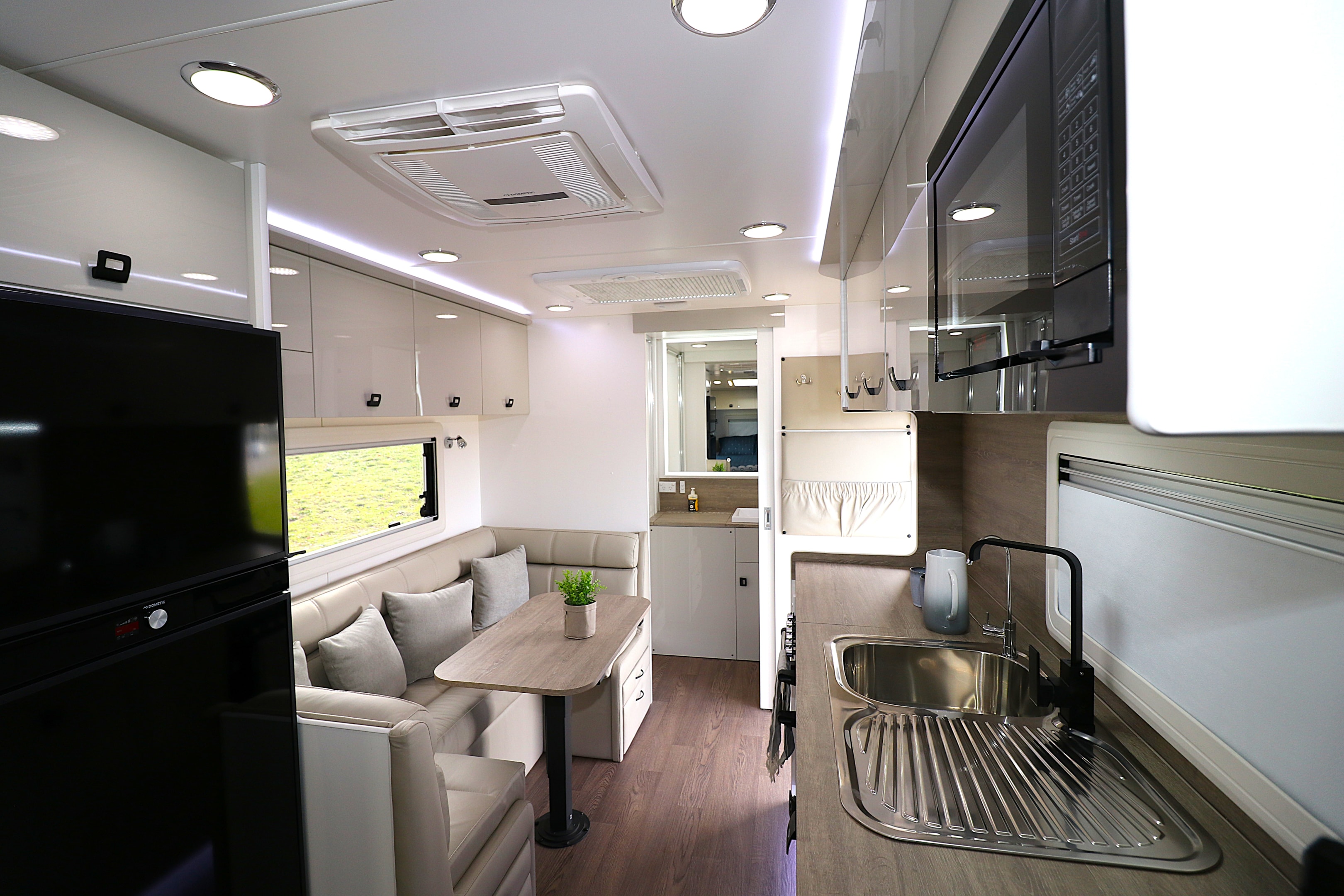 Our demonstration model provided all the comfort and facilities required for a pleasurable stay, even in remote locations. It’s ideal for a travelling couple with a rear entry leading to a fully equipped kitchen with a most inviting club lounge opposite, a very generous slumberland with Queen bed and plenty of room to navigate, tonnes of lighting, ventilation and storage opportunities, plenty of refrigeration, an accommodating ensuite with full size moulded shower and top load washing machine, reverse cycle air conditioning and some beautiful cabinetry, finishes, surfaces and overall presentation.