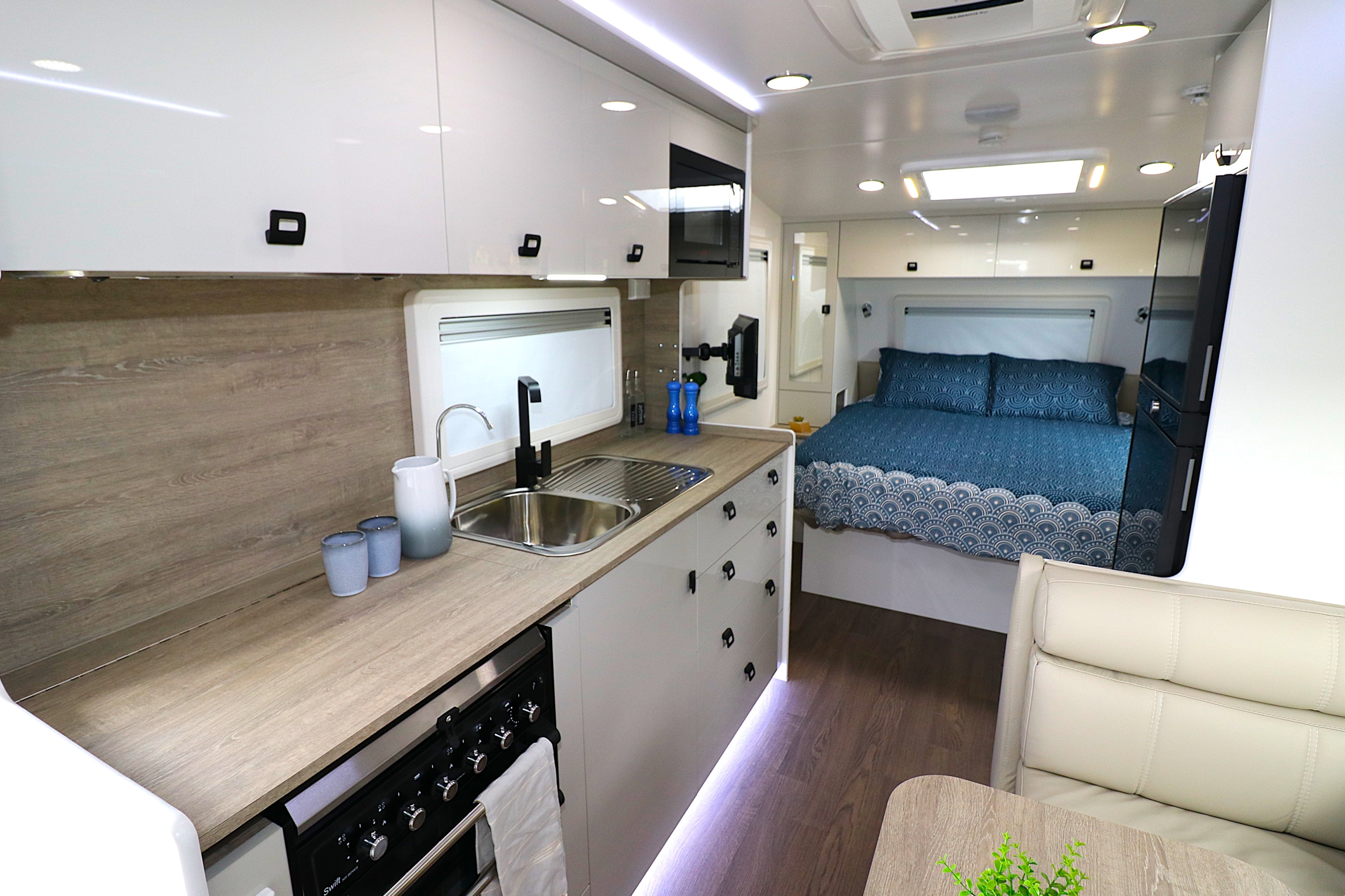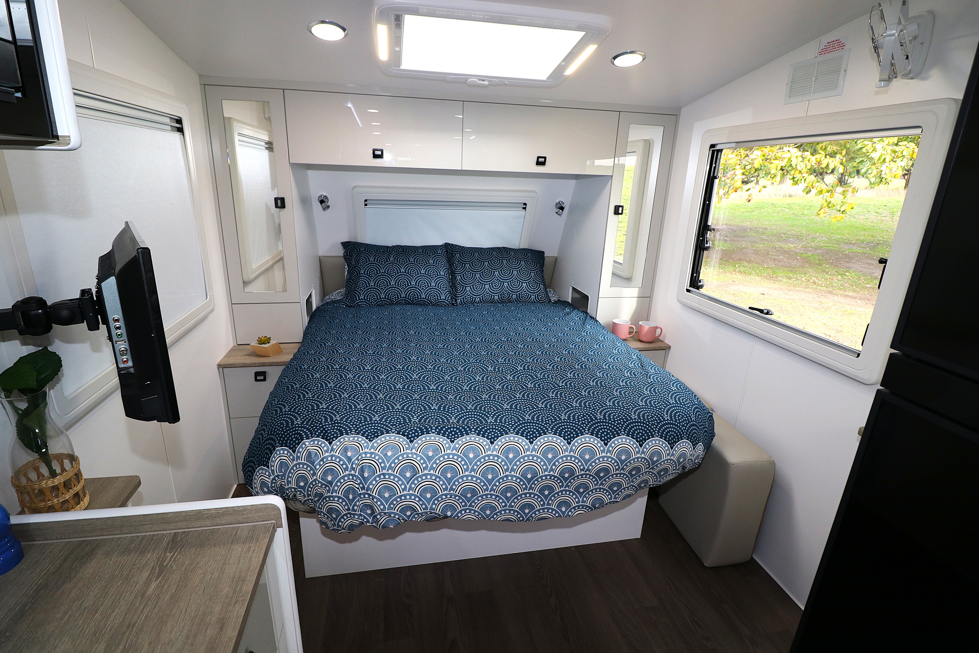 The bedroom is just as impressive, with large windows on either side and one at the bedhead, perfect for waking up to a dream like campsite view. Inside, you'll find heaps of storage, including wardrobes, a chest of drawers, overhead cupboards, and knickknack nooks. The bed is equipped with individual reading lamps, mood lighting, a TV bracket, and an overhead sunroof with flyscreens and block-out blinds. And, if that's not enough, there's extra storage space under the mattress, too.