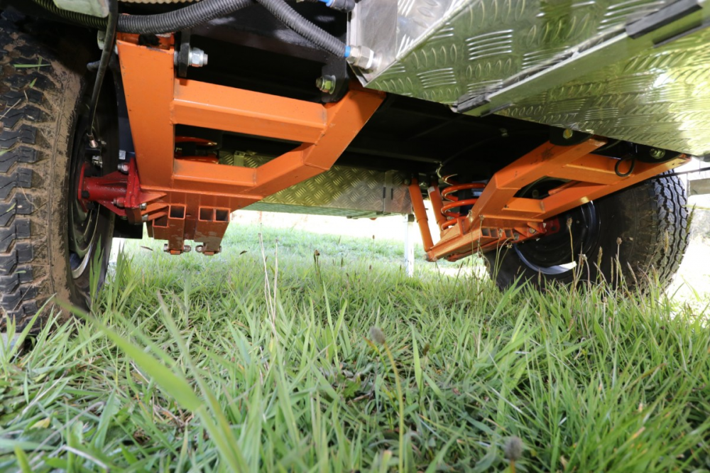 The unit rides on 16" rims and all-terrain tyres, with optional orange highlights matching the decals and hammertone black paint. Lumberjack Campers manufactures its own independent trailing arm suspension that incorporates 12" electric brakes with breakaway and a mechanical handbrake. Its construction is very solid and cushioned by twin shock absorbers on either side, plus coil springs. The unit rides very well both on and off-road.