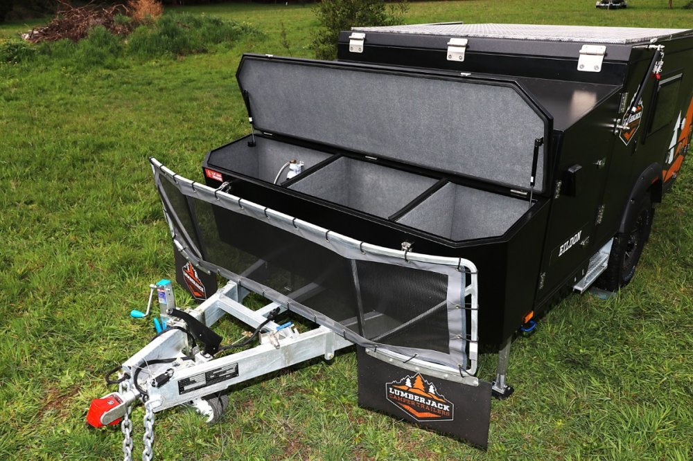 Let’s face it; there is a virtual plethora of forward fold campers on the market. Many originate from the same beginnings and are tricked up with various finishing accessories, paint jobs and packaging, all competing in a similar space. But the Lumberjack Eildon is a camper with a defined difference; it has a very deep tub with a traditional forward fold Queen bed up front, however, the back folds out to reveal an innovative bunk area that just may be the mobile accommodation answer for your flying circus.