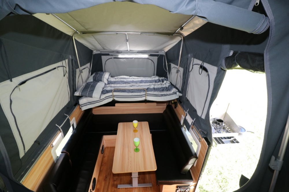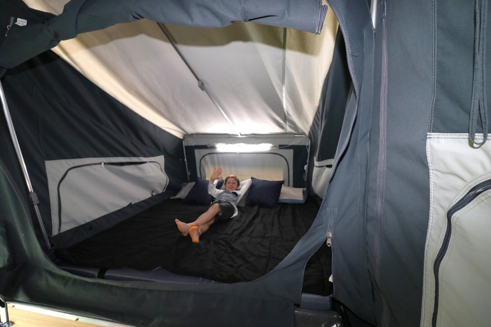 Once you have decided on your perfect campsite, levelled and stabilised the trailer, simply turn on the battery isolator and grab the portable remote for the automatic opening device that makes life much simpler and less strenuous. Much of the tent pops into place immediately; however, some added poles need adjusting in the rear for the bunk area, and every bow needs adjustment and tensioning with spreader bars. To be honest, there is a bit of effort involved, but you will develop your own system with practice. The tent is quite high, which offers a spacious feel, but make sure you attach the outer awning roof before you fully lift it, or carry a ladder – it’s a long way up!