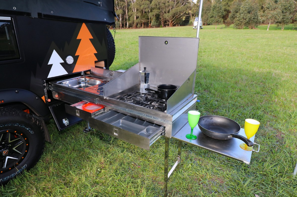 Lumberjack's external kitchen is a highly efficient unit. The stainless steel kitchen slides out smoothly and locks into place with adjustable legs. It features a fold-back tray above the sink, creating extra bench space alongside the sink's draining board, plus a pull-out extension—you can never have too much bench space! The 4-burner stove with a wok burner and wind guards can cater for the whole production cast. They have included two sliding utensil drawers and any recessed compartments; however, there is no real pantry.