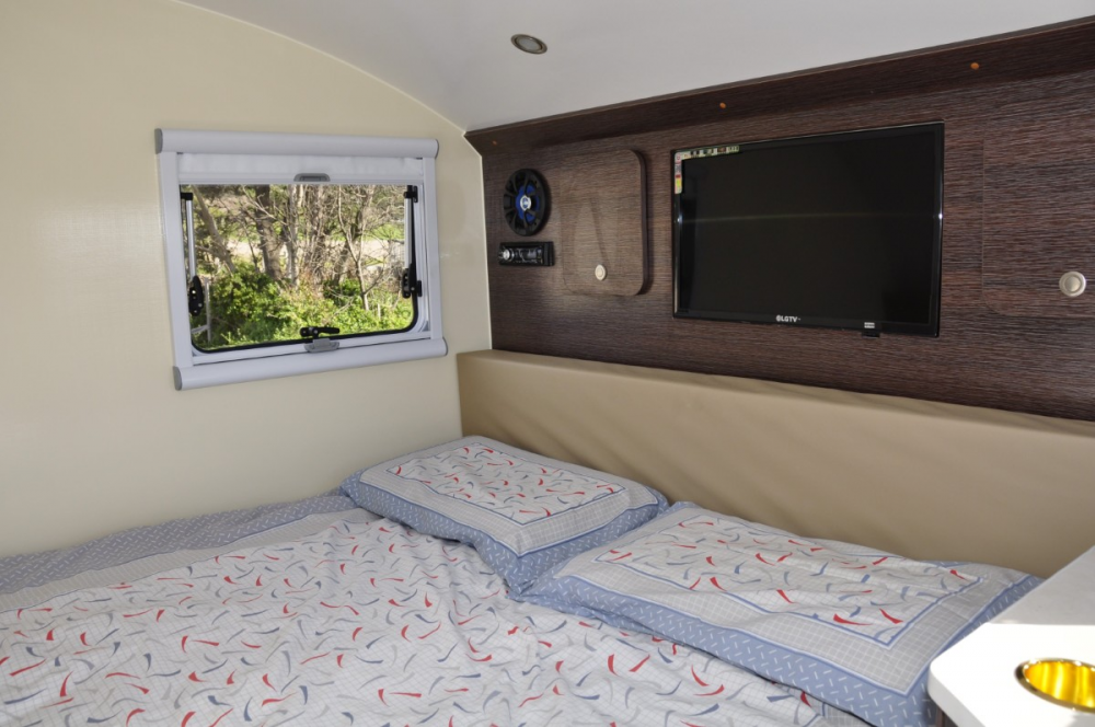 There is some cupboard storage, but not tons. I liked the interior layout, especially the bedside cabinet with a flat surface and shelf for stuff like water, glasses, a book, or charging your phone with the USB and HDMI ports. There is an electrical control centre for entertainment (radio and TV), lighting, fan, as well as indicators for the water level, solar regulator, 240 and 12 volt power and climate control. It combines a 45 litre polyethelene water tank, plus a 100 AH AGM battery and an AC charger as standard.
