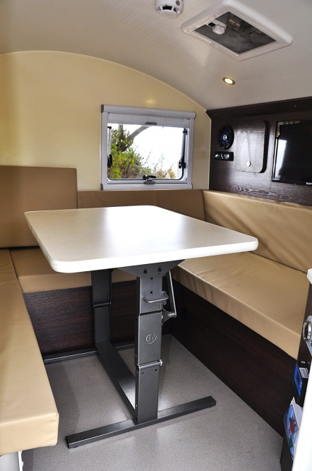 Inside is a comfy, compact U-shaped seating area with a drop-down table that could host a little party. You can remove the table for outdoor use or drop it down to include in the base for a Queen-size bed. There's decent headroom, LED mood lighting, a 21" TV in the rear wall, heater/AC, and a decent Bluetooth sound system.