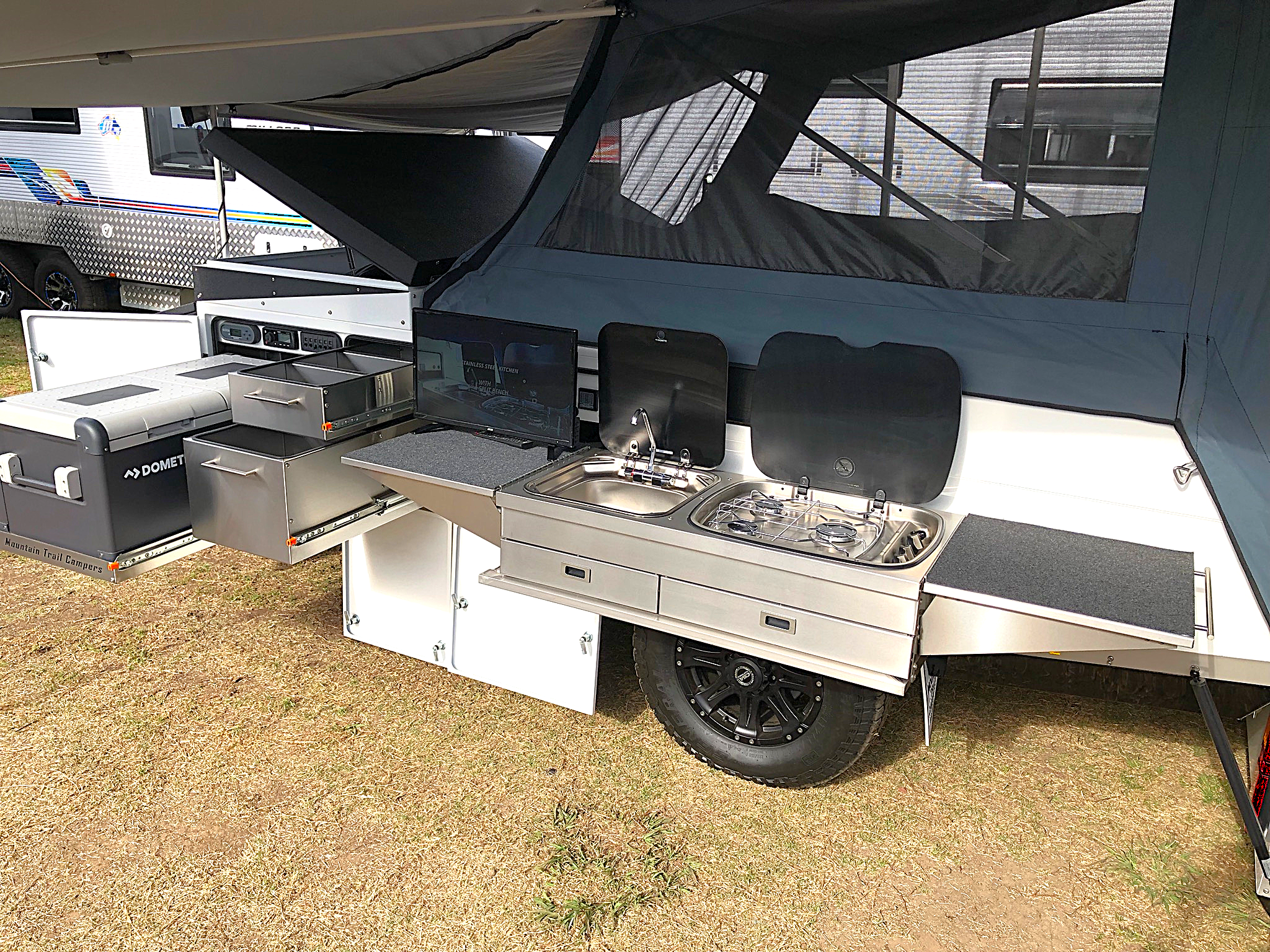 Up front is a ripper fridge compartment capable of housing the largest coolers, this one a whopping 95 litres. Such compartments are also carpeted and feature automatic lighting and ample ventilation. Right next to the fridge is a huge twin-drawer pantry, and then an MTC-designed stainless steel slide-out kitchen with a 3-burner stove, sink with a glass lid, under-sink storage, 2 drawers, and an ample food preparation bench. Mountain Trail now offers a smart swing-away-style kitchen as an option, which many will select for its greater ergonomics.