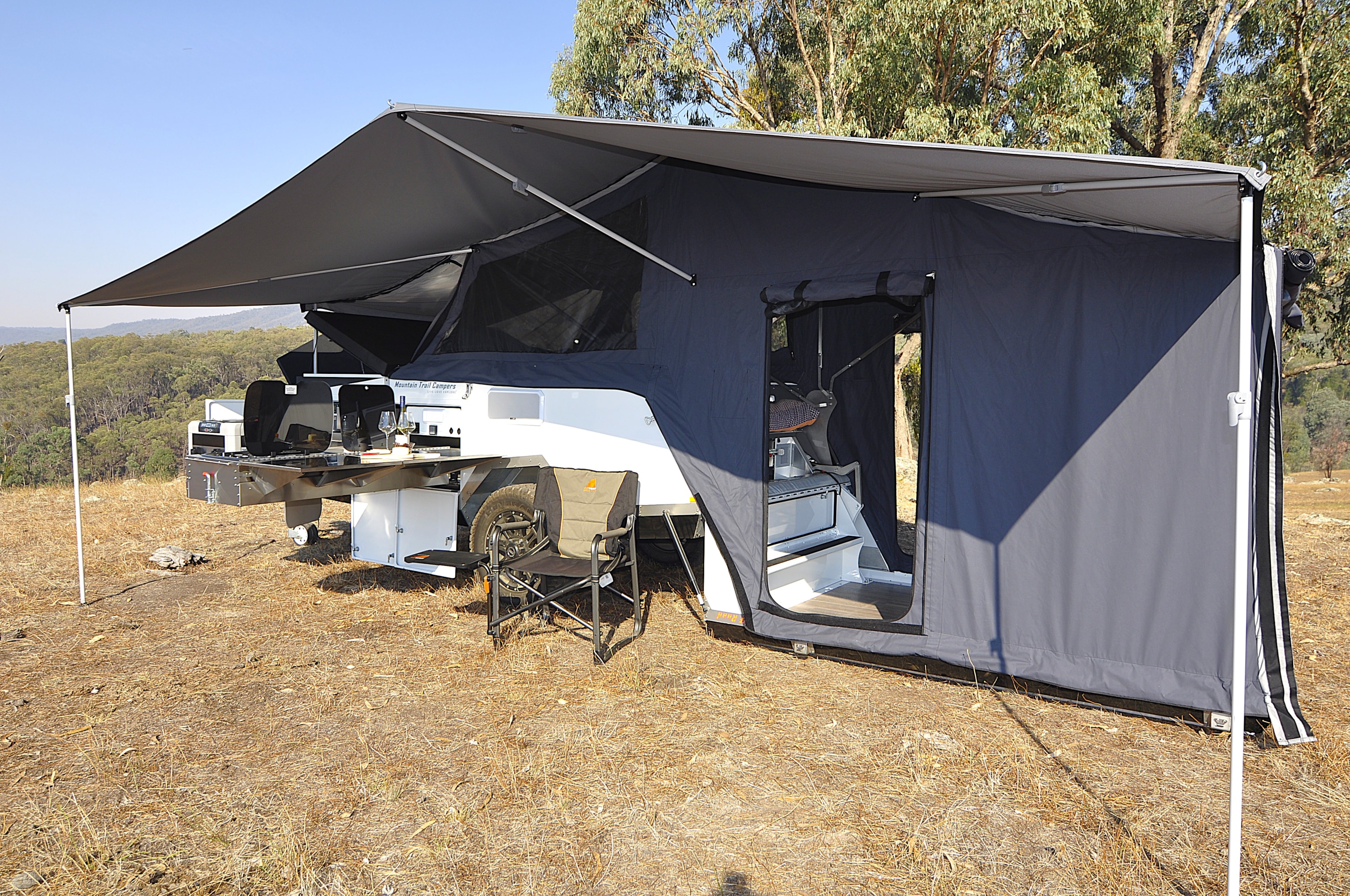The last thing you want at the end of a long road is the frustration of complex set-ups, so Mountain Trail RV have gone to enormous strains to simplify our lives with push-button fold-over actuation that sets up and knocks down in a jiffy. It would take me longer to set up a swag than to set up this very complete campsite.