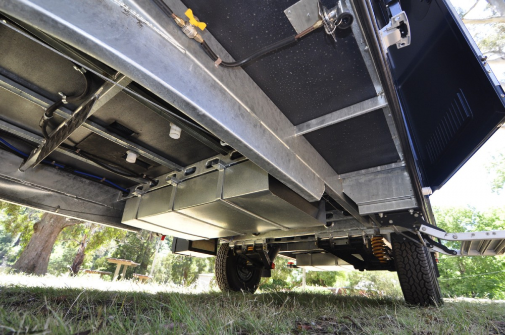 In this upgrade format, she rides on 16” AT wheels, which allow terrific ground clearance and pleasing entry and recovery angles. A single glance at the undersides will testify to premium construction. The 110-litre water tank and grey water tank, plus all the electrical and plumbing, are neatly fixed, lagged, and shrouded to avoid problems on those long, rugged tracks. There’s even a weatherproof floor liner for longevity and added underbody protection.
