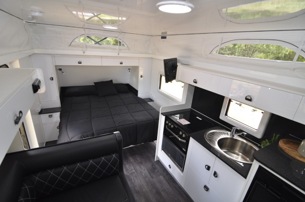 However, it’s not only the superbly designed and engineered Walkinshaw galvanised chassis teamed with the capability of Cruisemaster XT independent trailing arm suspension and DO35 articulated coupling where you find the innovation – New Age have developed an all-new roof construction that features a domed insulated composite with durable aluminium top and unique roof surrounds. This provides insulation from the elements and promotes greater run-off, dramatically reducing the opportunity for water ingress even in harsh tropical downpours.