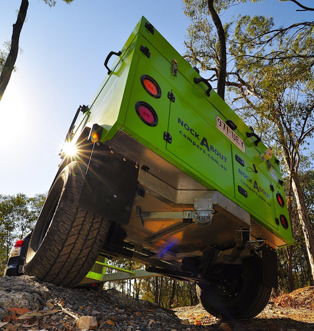We tested the NockAbout from its base in Slacks Creek, Brisbane, driving on mountain tracks around Mount Cotton before heading to a campsite at Mount Tambourine. I thought it would have basic leaf spring suspension, but nope, NockAbout built a fully galvanised box-section chassis with a sturdy independent trailing arm suspension made locally. It includes Firestone airbags. It handled great on paved roads, but off-road was where it shone – tracking smoothly over bumps and corrugations with good clearance and a solid relief angle. It stayed grounded even on rough terrain riding easily on its 14" sunrasia style wheels and stopping efficiently with its 10" electric brakes. Most production models can have 16" wheels with 5 or 6 studs to match the customer's vehicle. There's plenty of clearance in the wheel arches for different wheels and offsets.