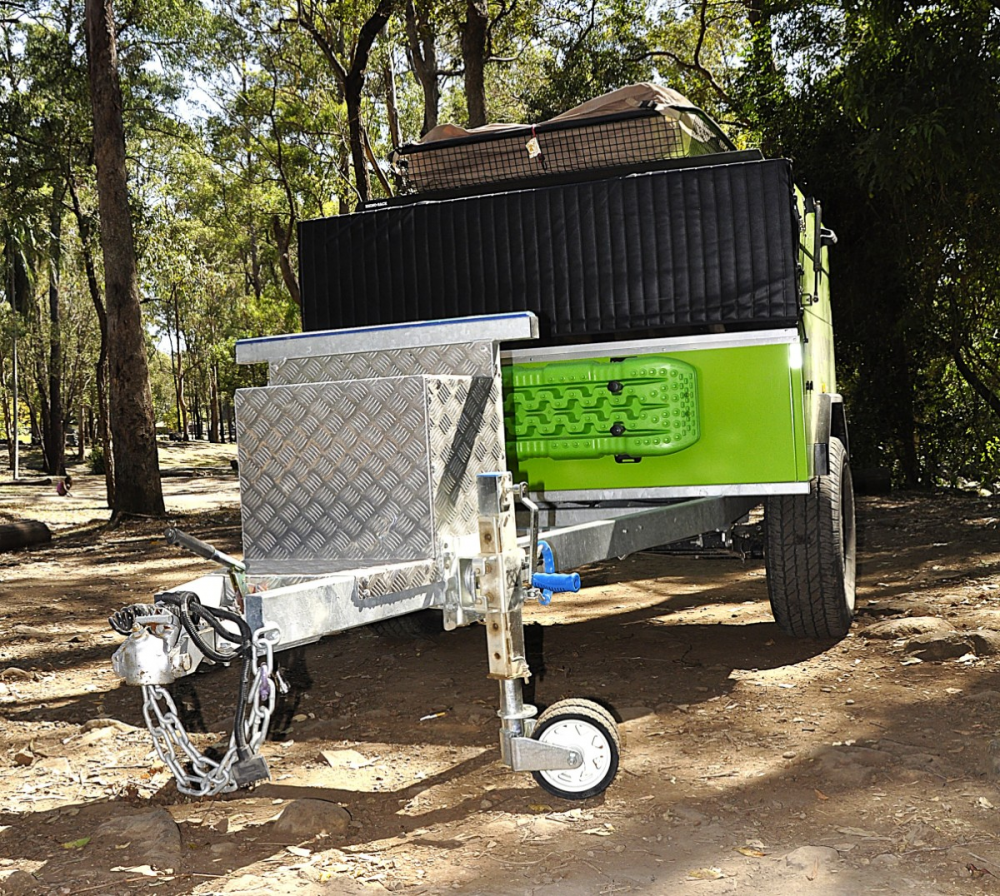 It looks like a little green box on wheels, but it's a solid base package that you can customise to fit your lifestyle. This one had a top-loading basket and Max Trax mounts, but Dal will tailor it to taste. There's unused space on the drawbar for racks (motorbike, outboard, generator) or storage for tools, gas, fuel, or even a compressor. Most campers want a kitchen and pantry. Dal suggests the Drifta range as an option – you can put it on the drawbar or have it slide out from the tub.