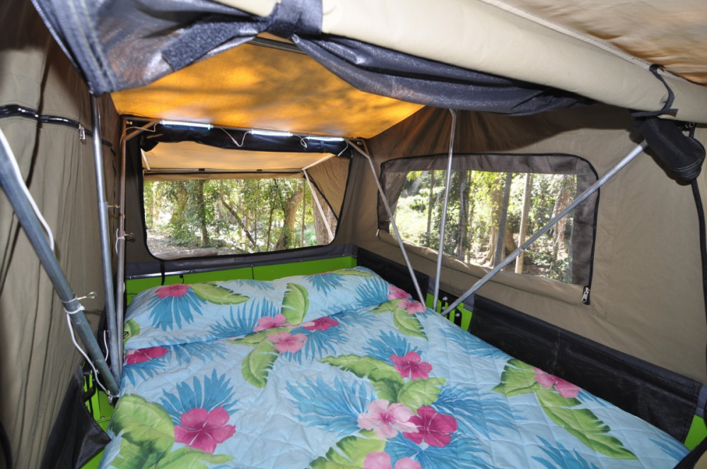 You'll be surprised how big the tent area is – it pops up and tensions easily with three cantilevered bows. There are wing awnings with simple frames to extend the covered area. Inside is a big foam mattress, or you can opt for a 100mm innerspring with a comfort cover. Overhead are LED strip lights, plus there are awnings, midge-proof flyscreens, and high-quality zips. The tent is made from premium Dynaproofed Billabong Wax Converters canvas.