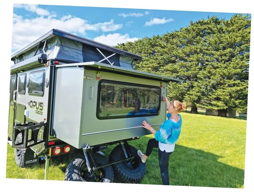 “Some users are going to find the pop-top roof hard to lift as a one-person job. An air-conditioner and four solar panels mounted on the roof are fantastic features, but contribute to the weight that needs to be pushed up. (As a result of this review, Opus committed to a design change to make roof lifting easier.)