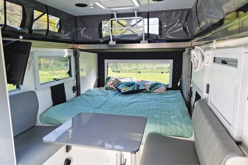 “If you pull up to a campsite late and the weather is battling against you, you could sleep inside without opening up the sleeping quarters or even popping the roof. You would certainly have to be on friendly terms, but it is very doable.