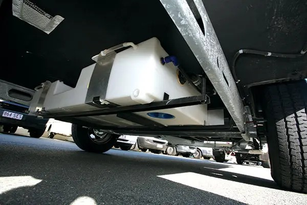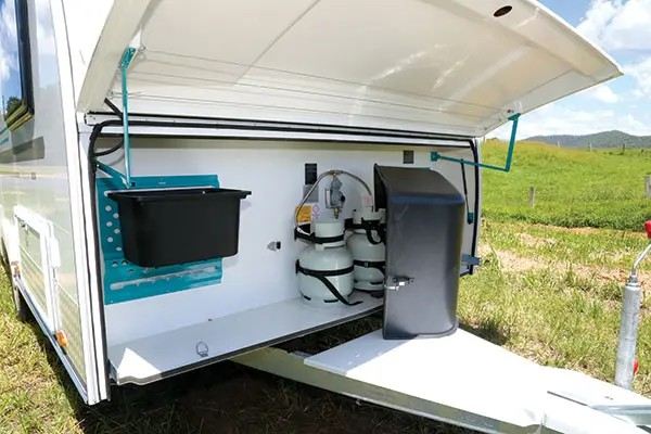 Slightly different to the usual style, the front boot lid is the entire lower half of the front wall. It lifts easily to give access to the two 4.5kg gas cylinders, which have their own separate cover, so other items can be legally stored in the boot. The lack of a lip on the boot creates a few difficulties for holding items such as hoses and power leads. However, the punched hole mountings with clip-on plastic bins are a great idea and work well.