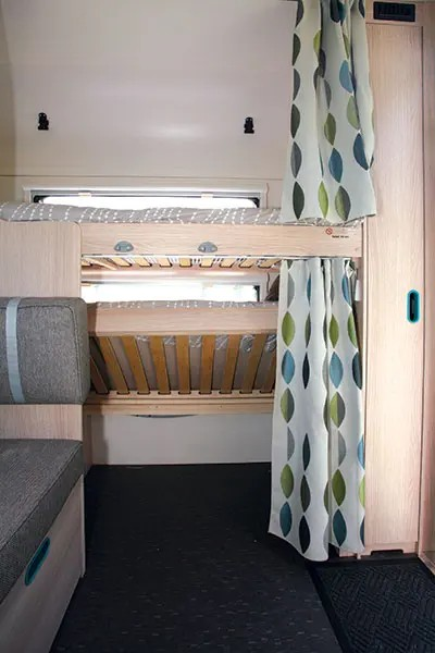 Starting in the rear, the bunk beds are well sized at 1.85x0.61m (6ft 1in x 2ft 1in) and whilst not as sophisticated as some I have seen, ie, with a DVD player, they do have a reading light and a large window each.