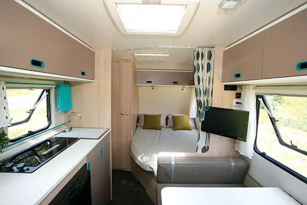 Although a five-berth van, many may find it a squeeze around the table but four should have no problem at all. TV watching will be a bit of a trick, given it’s mounted behind the forward seat but maybe the lower bunk could be utilised by family members for family viewing.
