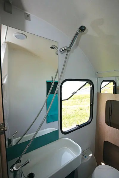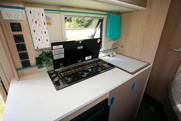 Adria’s combo three-burner cooker and stainless steel sink work very well here—it still leaves a bit of benchtop space for cutting veggies and washing up. Under the bench, a 100L Dometic fridge is found, but there’s no oven or microwave. Storage is limited to the overhead lockers and the cupboards with slide-out plastic boxes.