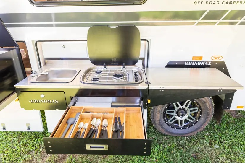When the tummy starts to rumble, it's good to know that the gourmet kitchen is but the releasing of a few clips away. Appearing from a hatch in front of the wheel arch, the stainless steel kitchen first slides out, then an expandable benchtop extends along the side of the camper, creating a fantastic cooking/preparation area.