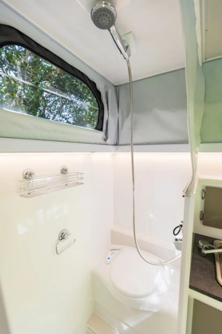 I may have left the best ‘til last. For those who don't mind ridding themselves of the day's grit and grime, there's something just for you. A full sized internal ensuite takes pride of place in the rear offside corner, complete with a Thetford cassette toilet and shower. The best thing is, even for all the tall folk, you can mount the shower to the roof and get the top of your head wet!