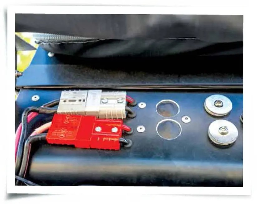 An upper Anderson plug can take solar input, while the lower red plug directs that to charge the battery.