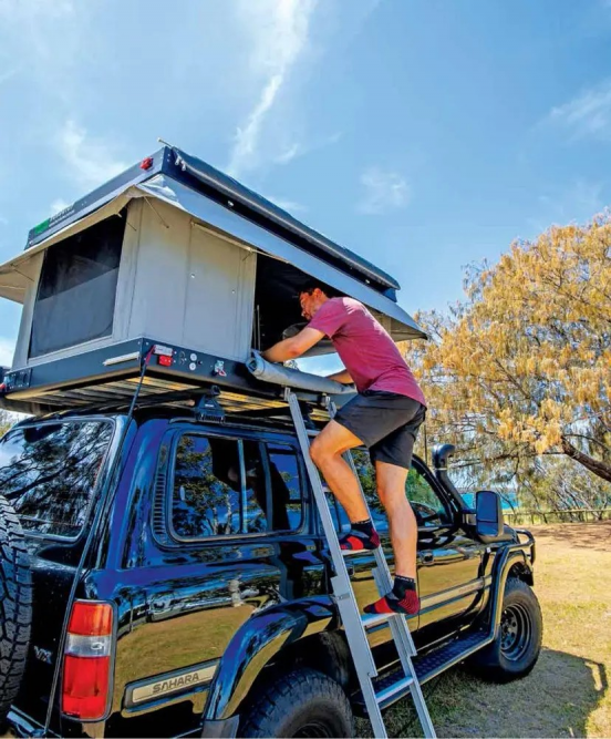 Any of the tent’s four windows are eligible doors, and the ladder can be mounted under whichever one the bracket mounts are fixed. The side windows will be the most logical ladder location for most 4WDs, but this being a non-expanding hard-lid tent, the ladder may block whichever door it is nearest.