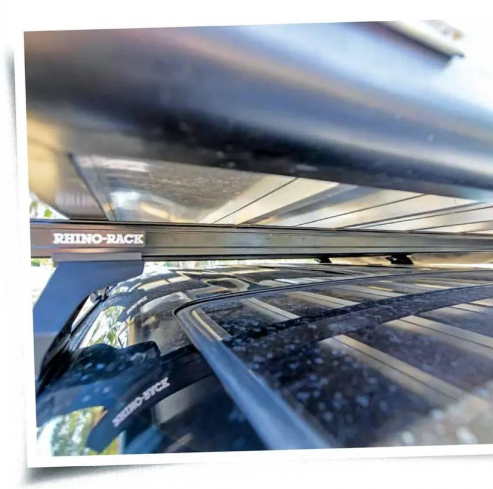The underside of the tent has six north-to-south structural aluminium bars responsible for bearing the load, which continue right to the ends. These bars sit flush against horizontal crossbars after installation, with no immediately obvious means of connection — at first glance, it appears superglued on. In reality, the tent is connected with bolts through direct captive holes in the tent base, secured underneath within the hollow interior of the roof rack rails with a cam lock nut.