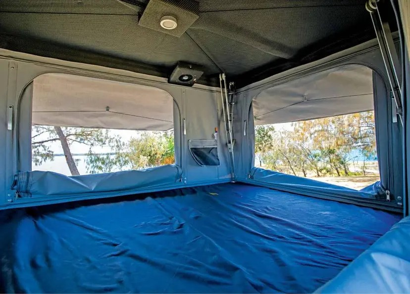 The high-density foam mattress, at 100mm thick, is thicker by 20 to 50mm than 95 per cent of others on the rooftop tent market. This makes a big difference, and you’ll be able to have a good night’s sleep without waking up with a bad back and pins and needles. Underneath the mattress, the surface is solid and flat, as it should be.