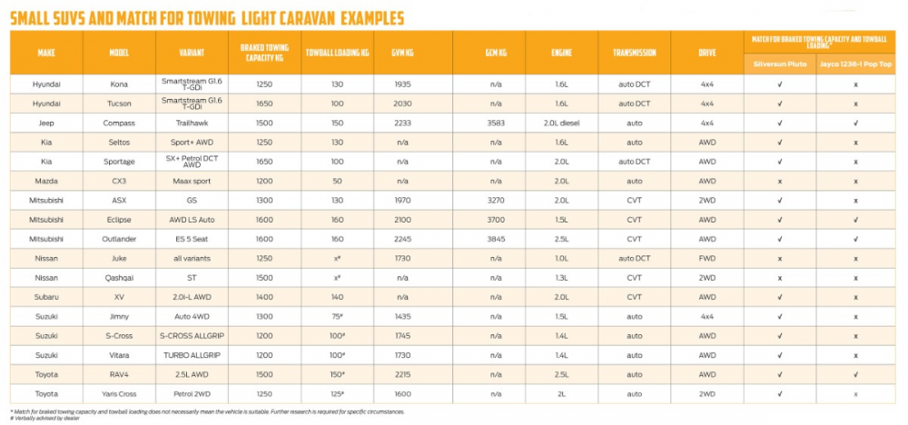 This is purely a desk research exercise to see which vehicles have suitable towing specs to match up to these two vans. The list is not exhaustive and is simply a random selection of a handful of well-known small SUVs. We arbitrarily made the cut-off vehicles rated up to 1650kg towing capacity to stay in the small car pond. (There are no doubt some great and possibly better choices in the 1800 -2000 kg tow rating category but we had to draw the line somewhere). We have not tow-tested any vehicles or made any further analysis of how they might perform.