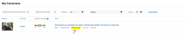 Once clicked this will display any listings or drafts you have, below the asset description is a "Mark Sold" button you can click.